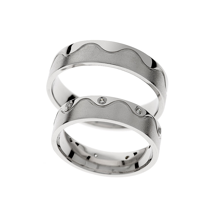 Découvrez l’élégance raffinée de nos bagues de mariage en or blanc 14 kt pour hommes et femmes. La première bague présente un solitaire optionnel en zircon cubique ou diamant totalisant 0,09 ct, taille step fine ronde, en sertissage clos. La deuxième bague est simple, épaisse de 5 mm, avec un design ondulé unique, toutes deux avec une finition polie brillante.