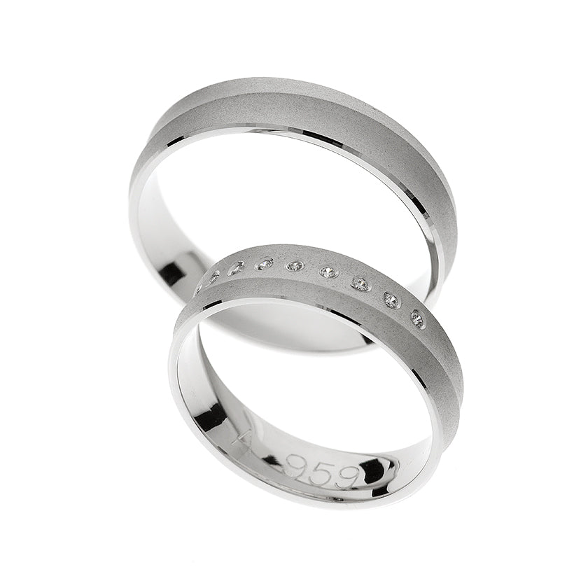 Ces alliances pour hommes et femmes sont fabriquées en or blanc 14 carats avec une finition mate sophistiquée. Avec une épaisseur de 5 mm et une forme ronde classique, une bague est ornée d’un diamant ou d’un zircon cubique de 0,045 ct en sertissage clos, tandis que l’autre reste élégamment simple ; les deux bagues présentent un design linéaire.