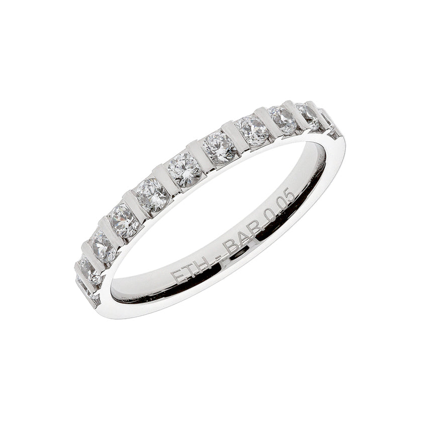 This exquisite 14kt white gold wedding ring for women features a 3.1mm band in a half eternity design. It is embellished with 0.55ct of optional stones, available in cubic zirconia or diamonds, set in a bar setting. The round fine step-cut stones add a brilliant sparkle, making it a perfect symbol of eternal love.