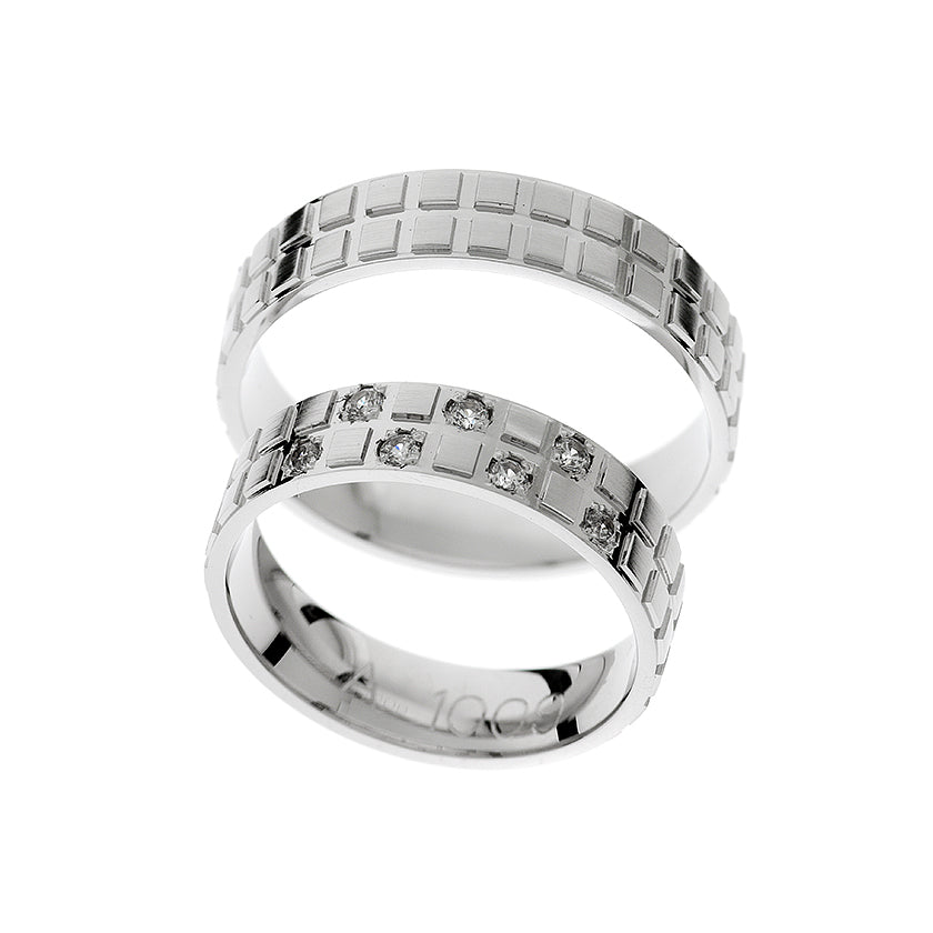 Cette bague de mariage en or blanc 14 carats, conçue pour femme et homme, présente un anneau de 5 mm avec un motif carré distinctif. La bague peut être portée seule ou personnalisée avec un zircon cubique ou un diamant rond taille fine à degrés de 0,14 ct, serti à griffes. Un mélange unique de design moderne et d’élégance intemporelle, parfait pour votre journée spéciale.