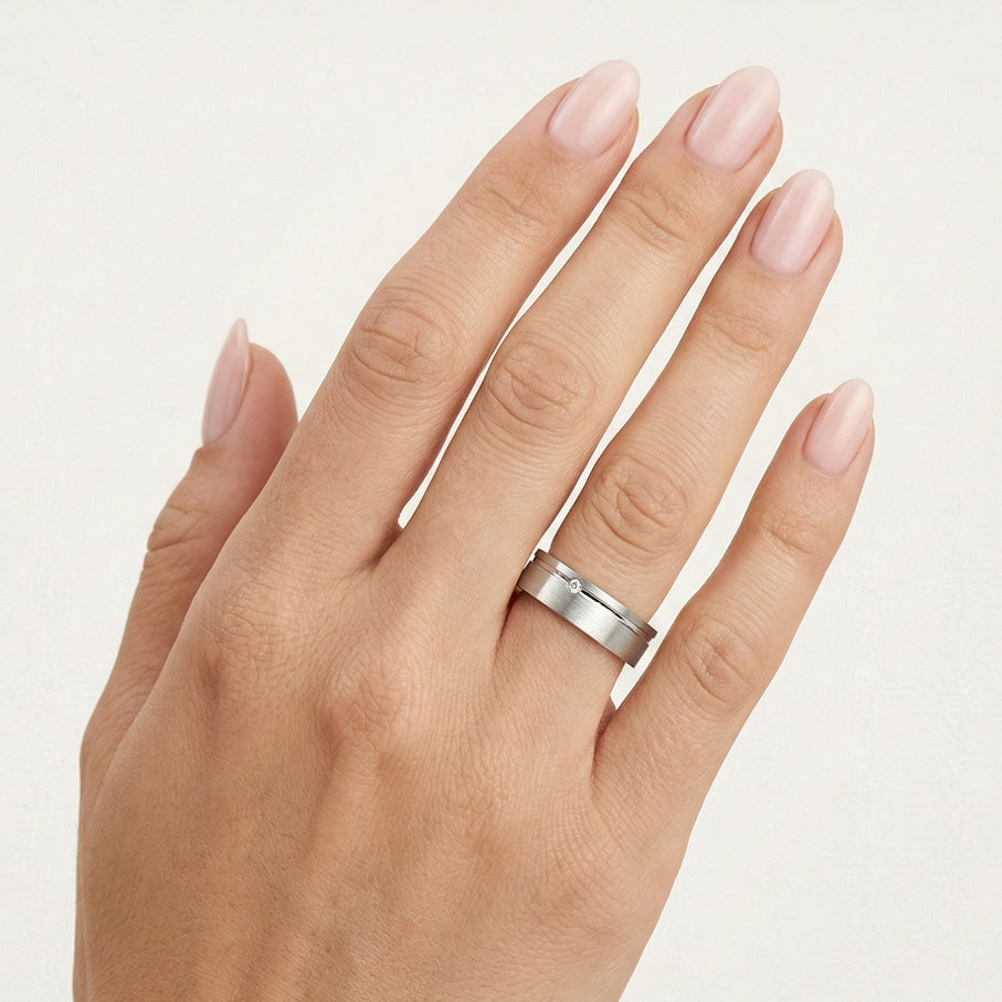 Cette magnifique bague de mariage pour hommes et femmes est fabriquée en or blanc 14 kt. L’anneau épais de 6 mm présente un design massif à bords carrés avec une forme ronde classique. Vous pouvez choisir d’ajouter un zirconium cubique ou un diamant de 0,02 ct taillé en fines marches rondes, serti en chaton, ou laisser l’anneau simple pour une touche unique.