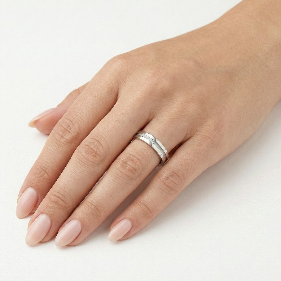 Bagues de mariage exquises en or blanc 14 carats pour hommes et femmes. Une bague est ornée d’oxydes de zirconium ou diamants totalisant 0,015 ct, taille ronde à facettes fines, sertis clos. La seconde bague est simple. Les deux bagues présentent un design unique avec une ligne gravée autour de l’anneau, finition mate et côtés hautement polis, avec une épaisseur de 4 mm.