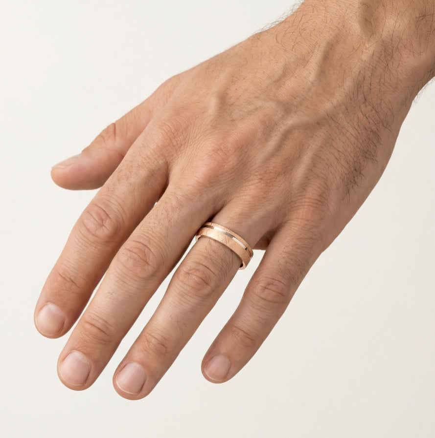 Cette alliance en or rose 14 kt avec un canal en rhodium blanc est disponible en version simple avec une épaisseur de 5 mm ou ornée d’un oxyde de zirconium ou d’un diamant de 0,05 ct serti clos avec une épaisseur de 4 mm. La bague présente une taille fine en escalier ronde. Parfaite pour les femmes et les hommes qui souhaitent un symbole solide et sophistiqué de leur engagement.