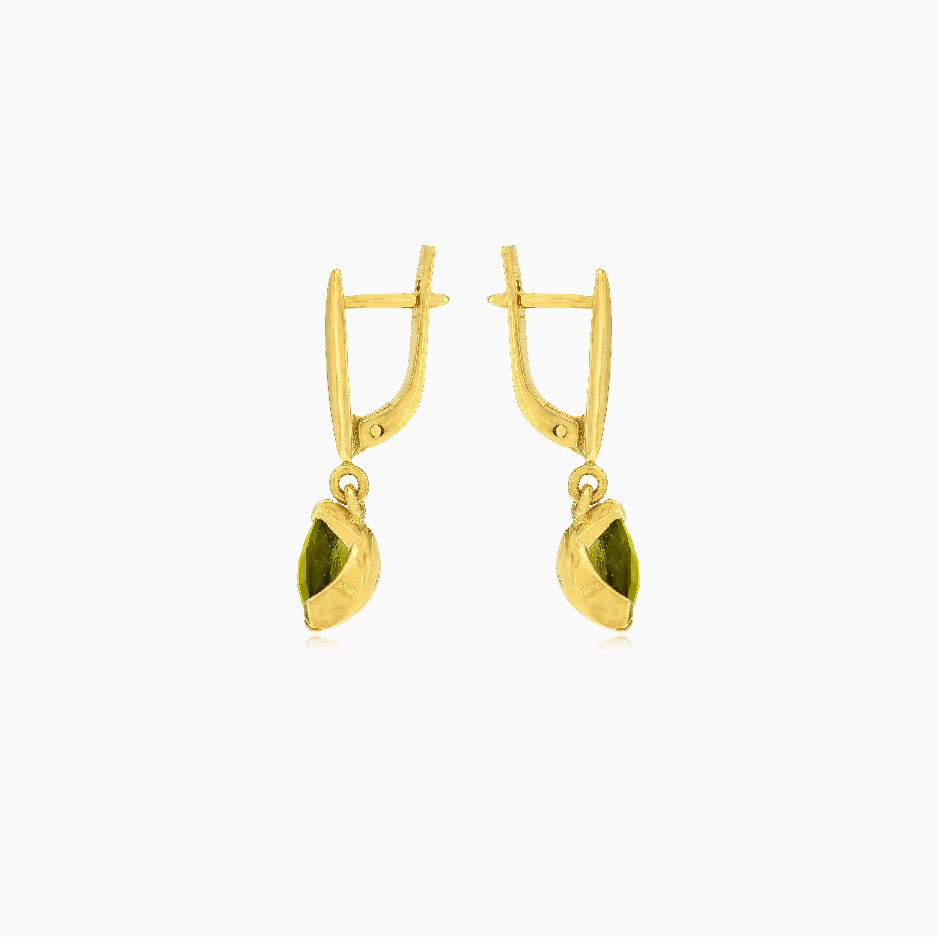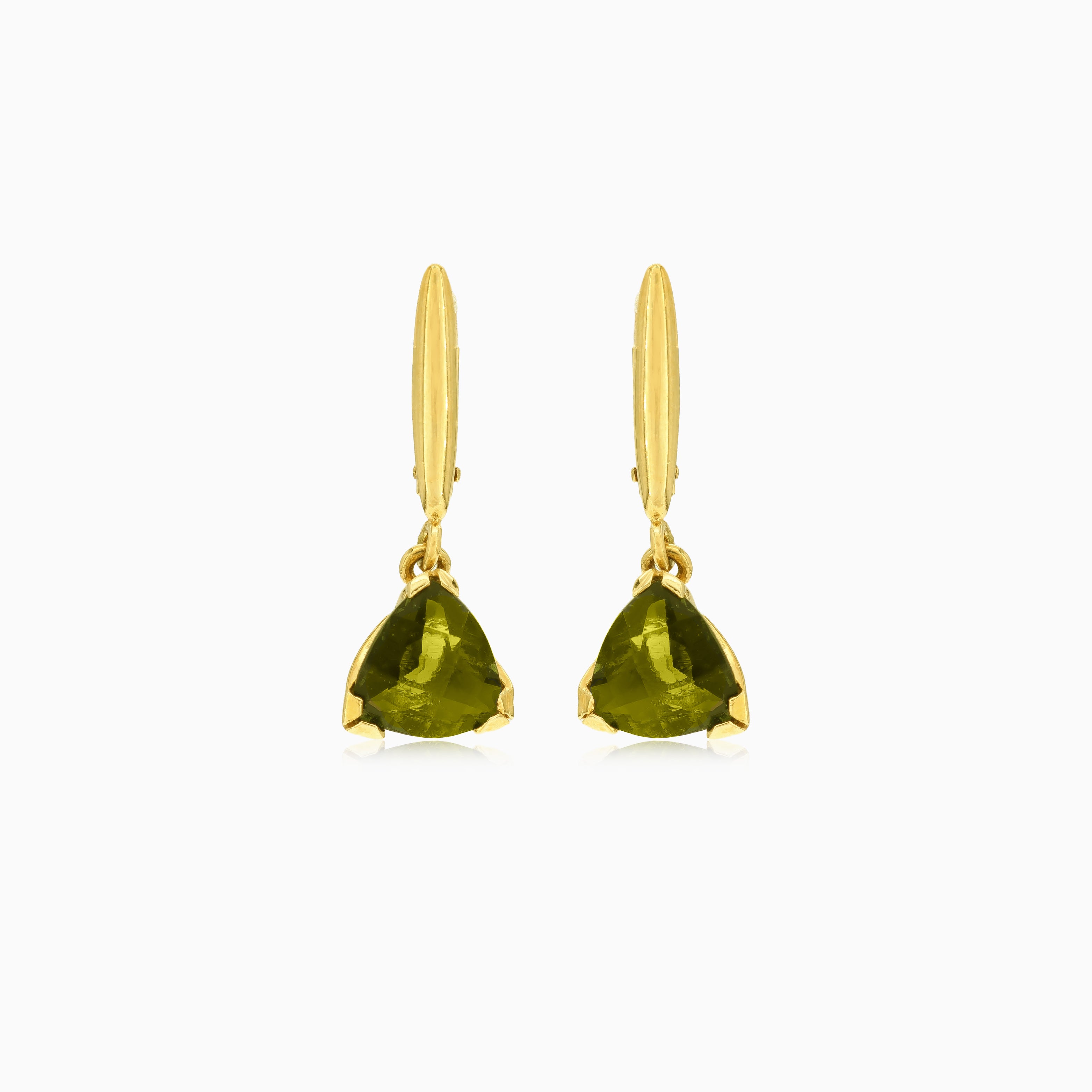 Sublimez votre élégance avec ces boucles d’oreilles en or jaune 14 carats, ornées d’une moldavite taillée en trilliant à degrés fins. Le sertissage à griffes en V et le fermoir à cliquet garantissent un maintien sûr tout en ajoutant une touche de sophistication à votre tenue.