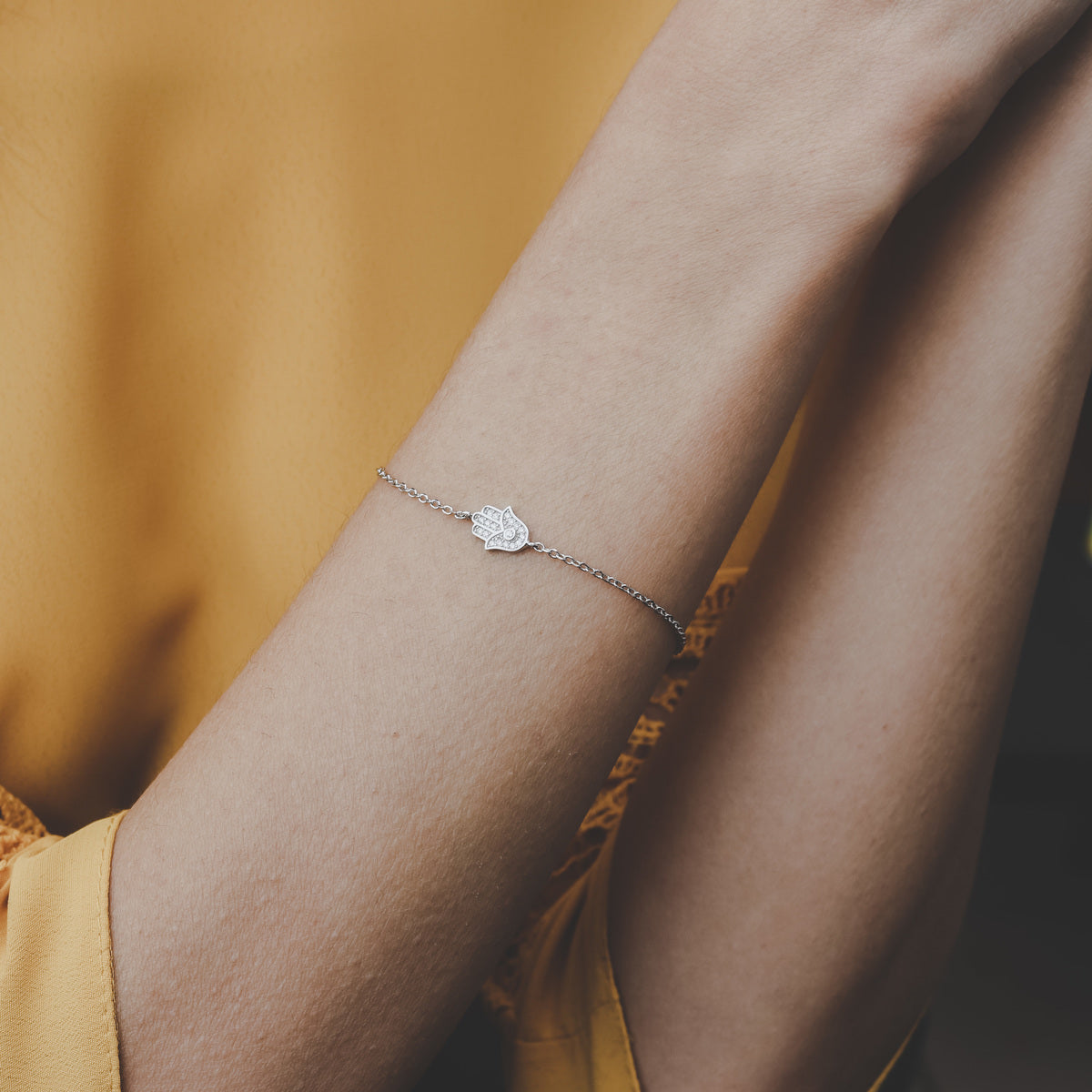 Bracelet délicat en argent sterling avec une main de Hamsa au centre, décorée de zircon cubique.