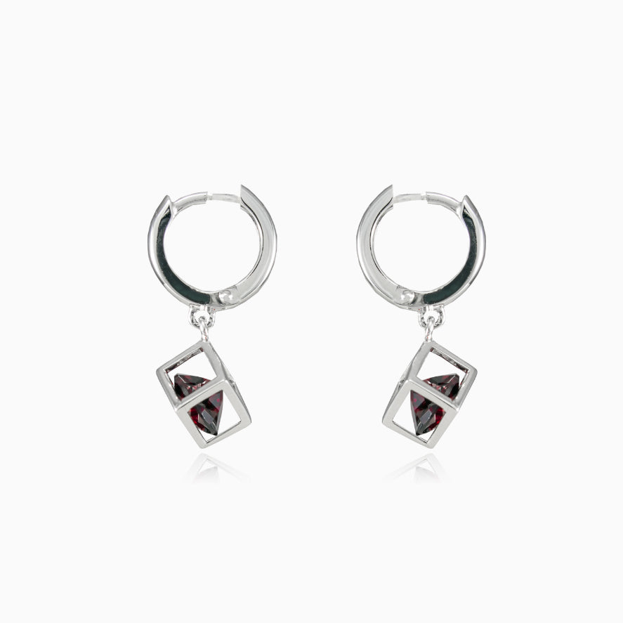 Boucles d'oreilles modernes en argent sterling pour femmes, associées à un grenat taille ronde dans une boîte en argent.
