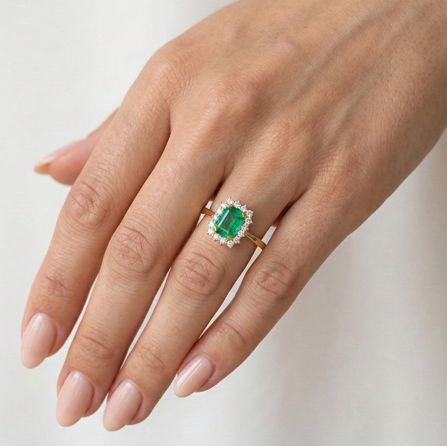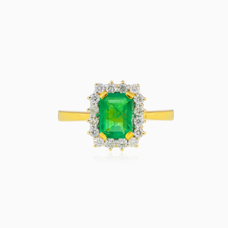 Bague imposante classique en or jaune 18 carats, associant une émeraude naturelle taille émeraude et un halo en or blanc serti de diamants taille brillant.