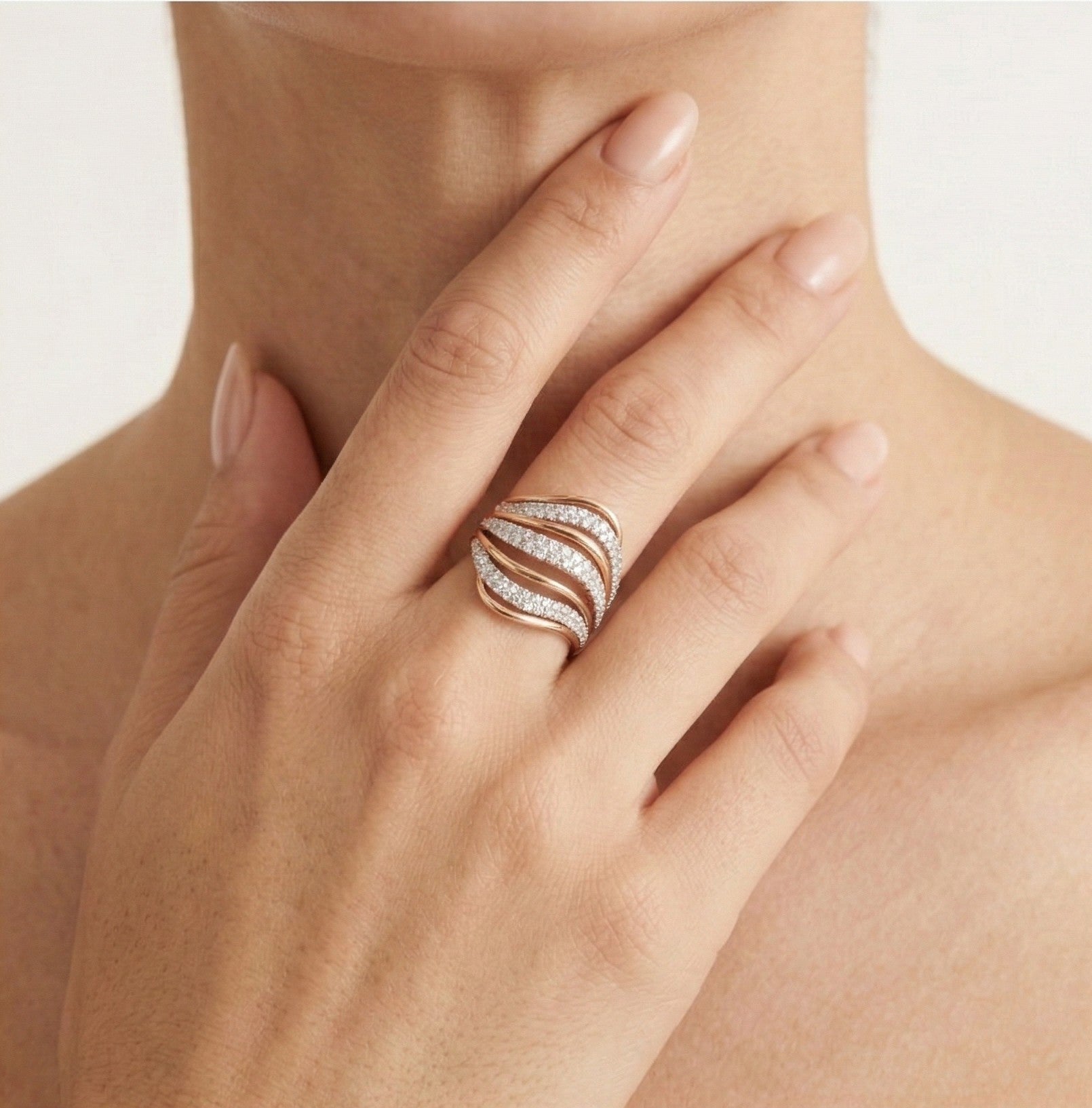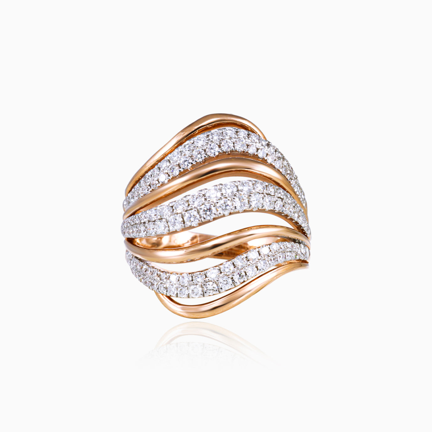 Élevez votre style avec cette magnifique bague en or rose 14ct. Composée de trois lignes torsadées ornées de diamants étincelants totalisant 1,06ct, cette bague présente un design fascinant. Les diamants sont sécurisés dans un sertissage à quatre griffes, ajoutant une touche d’élégance et de sophistication à la pièce.