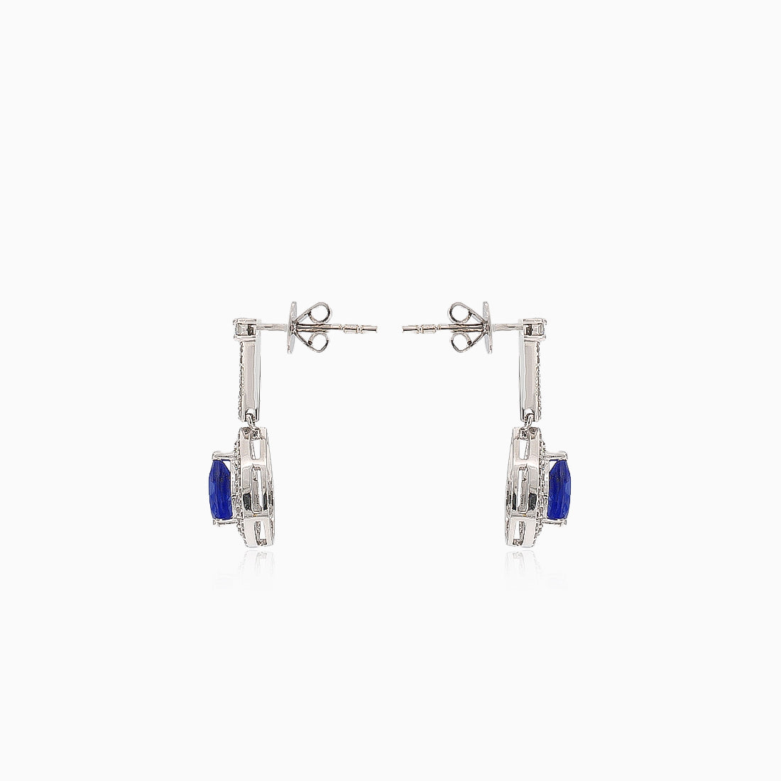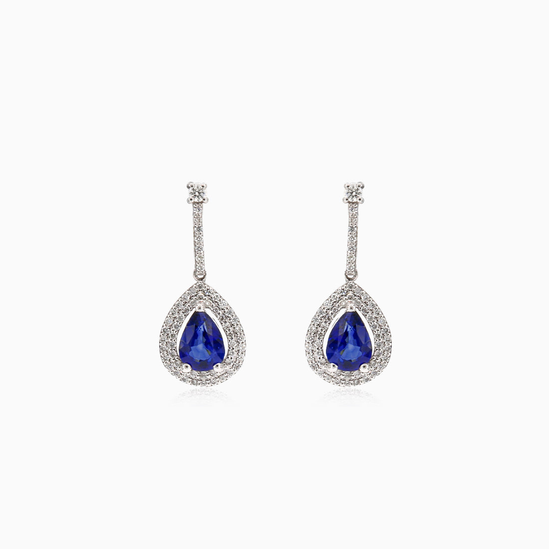 Fabriquées avec soin en or blanc 18 carats, ces boucles d’oreilles pendantes puzette royales mettent en lumière deux saphirs taille goutte totalisant 1,61 carat. Entourées d’un halo de diamants taille brillant pesant 0,44 carat, couleur G, pureté VS, elles se ferment parfaitement avec un fermoir puzette.