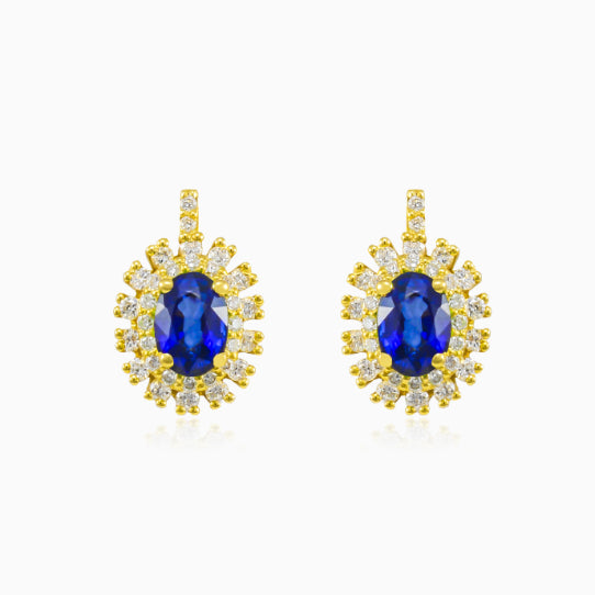 Superbes boucles d’oreilles fabriquées à la main en or jaune 14 carats avec des saphirs bleus naturels taille ovale et des diamants taille brillant.