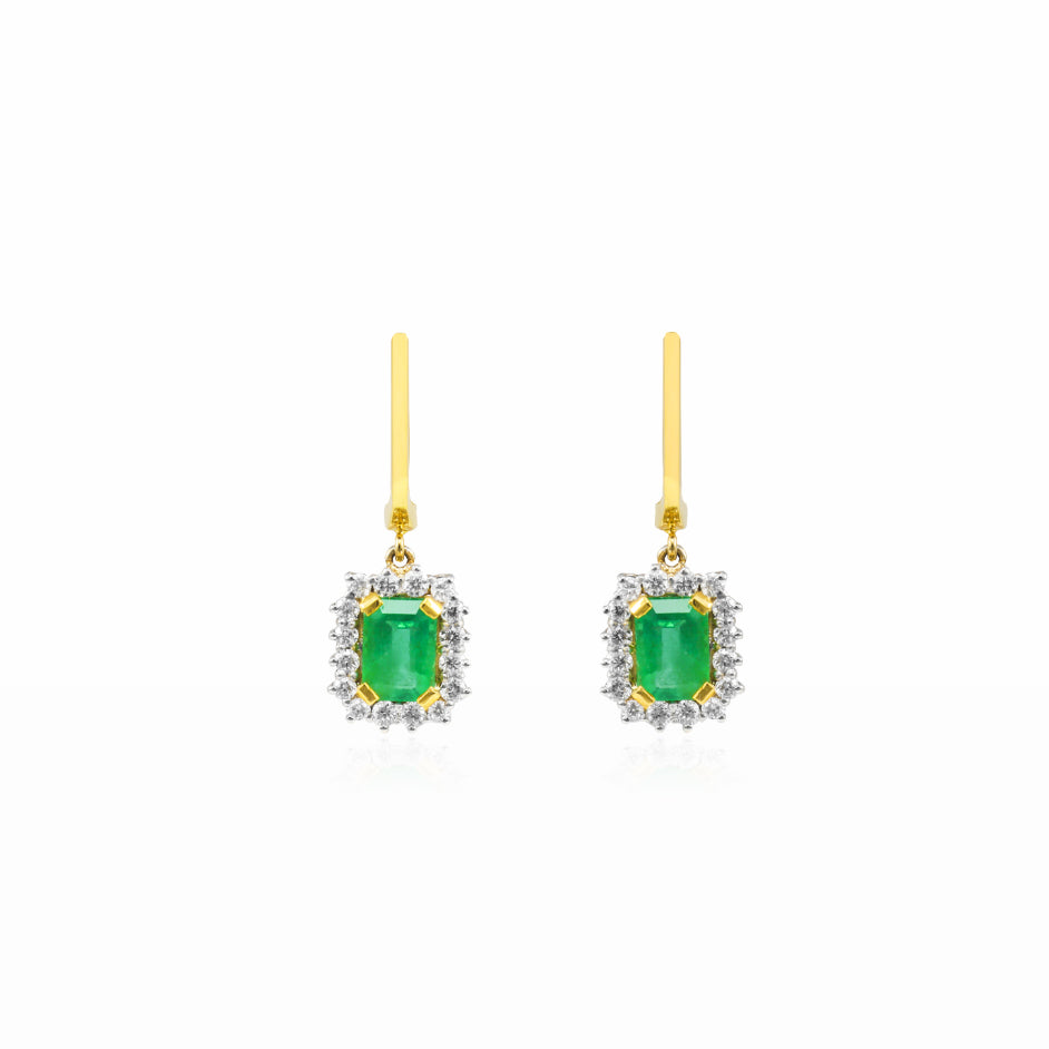 Boucles d’oreilles classiques en or jaune 18 carats, associant une émeraude naturelle taille émeraude et un halo en or blanc serti de diamants taille brillant.