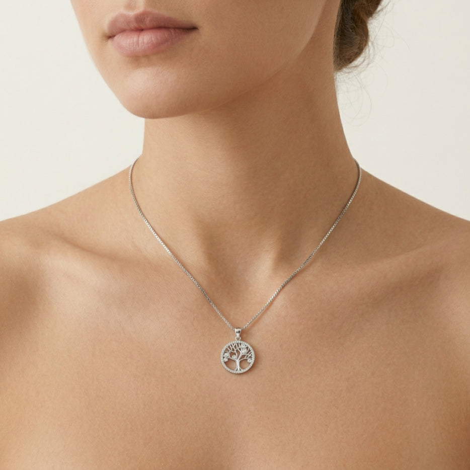 Arbre de vie en argent sterling combiné avec un halo de zirconiums cubiques et des zirconiums cubiques sertis en chaton parmi les branches de l'arbre.
