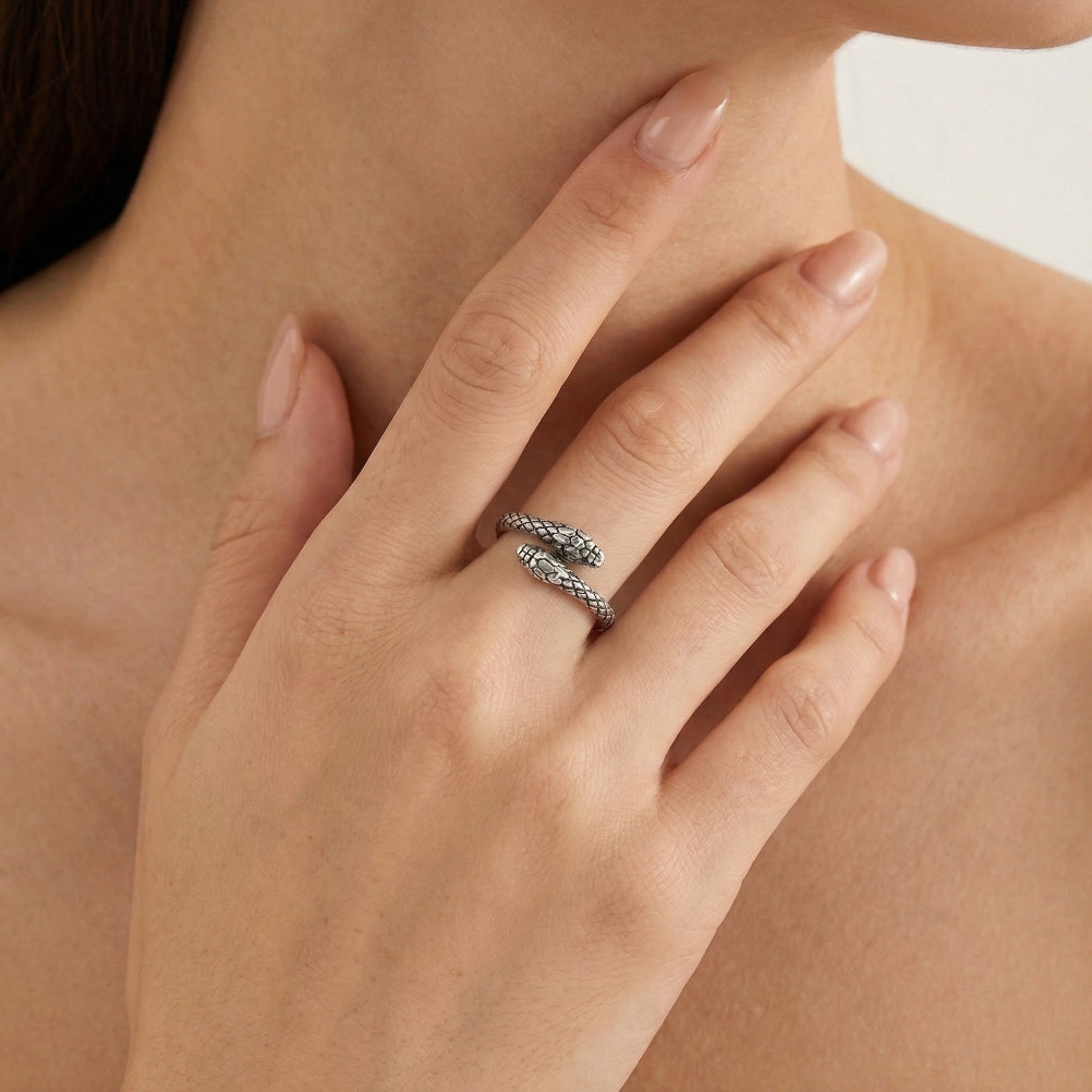 Bague serpent à deux têtes fabriquée à la main en argent sterling.