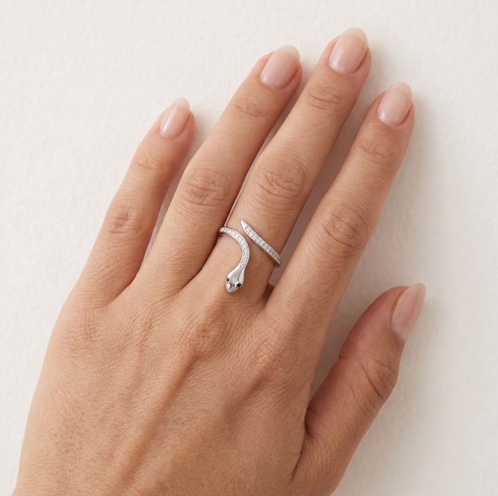 Bague statement en argent sterling en forme de serpent ajustable, ornée de zirconias cubiques et d'yeux en onyx.