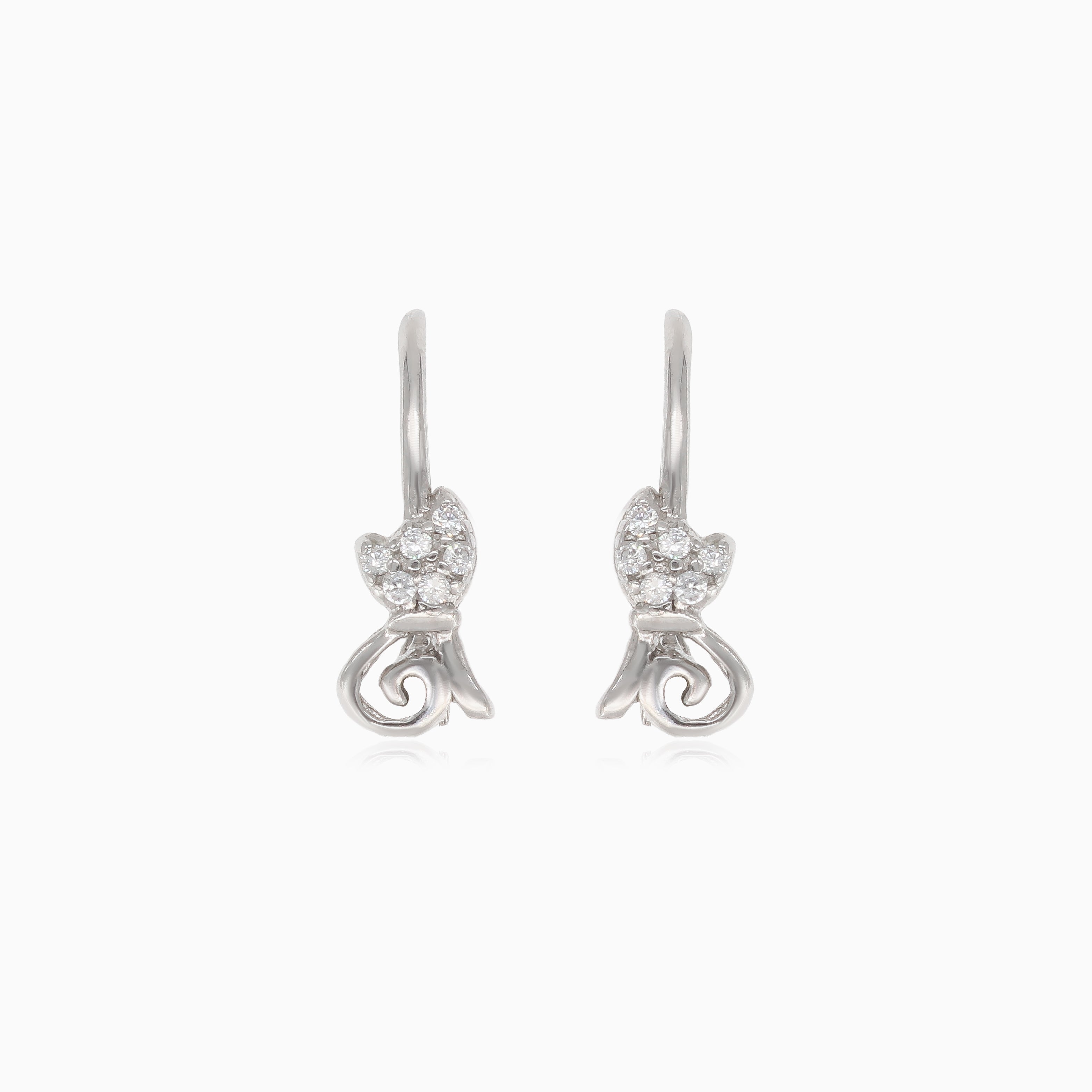 Apportez une touche de fantaisie à la tenue de votre enfant avec ces adorables boucles d’oreilles pendantes en argent, ornées de motifs de chatons espiègles décorés de zirconias cubiques scintillants, équipées de fermoirs à levier sécurisés.