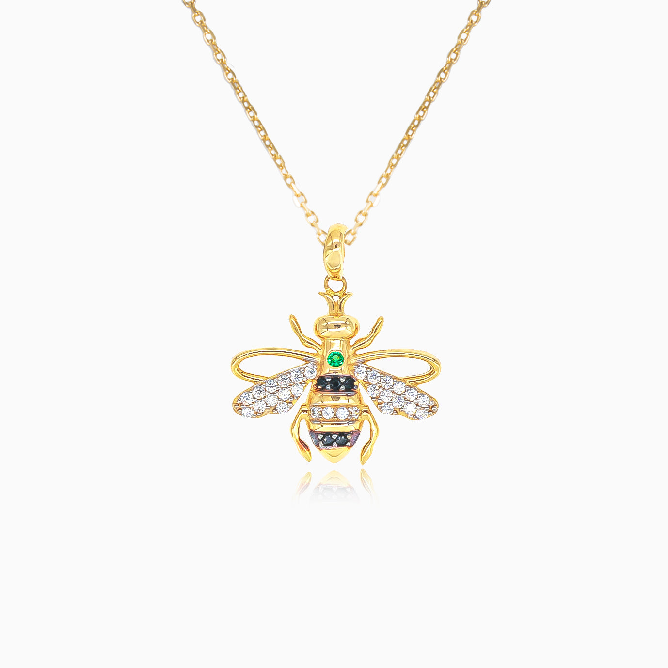 Façonné en or jaune 14 carats, ce pendentif abeille saisissant est orné de zirconia cubiques, d’onyx noirs et d’une émeraude synthétique. Pièce originale pour les goûts affirmés, il rayonne d’un éclat incomparable.