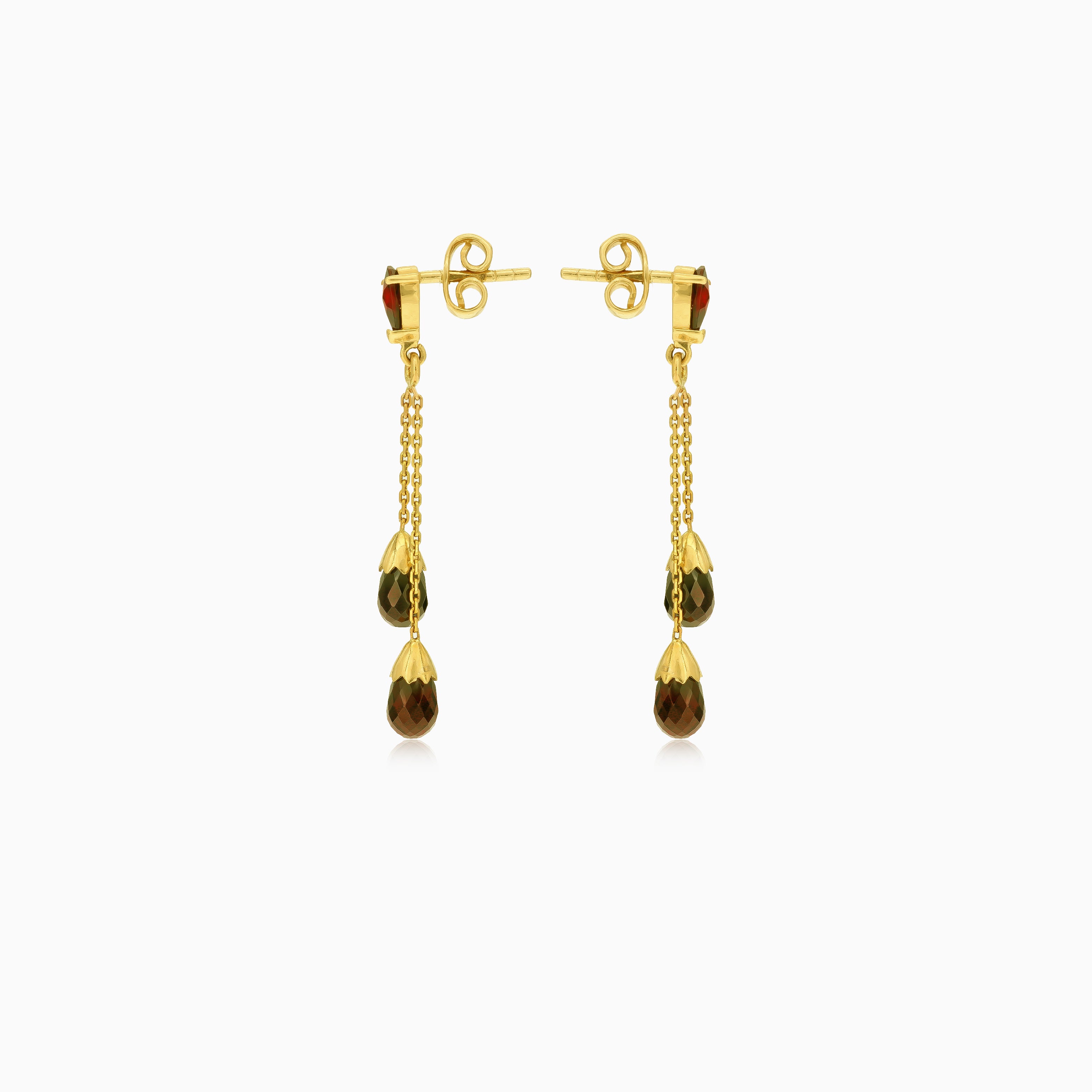 Élevez votre style avec ces élégantes boucles d'oreilles pendantes mettant en valeur deux grenats taillés en briolette poire et en poire avec étapes fines. Confectionnées en or jaune 14 carats avec un fermoir poussette et un sertissage à 3 griffes, ces boucles d'oreilles dégagent une élégance intemporelle.