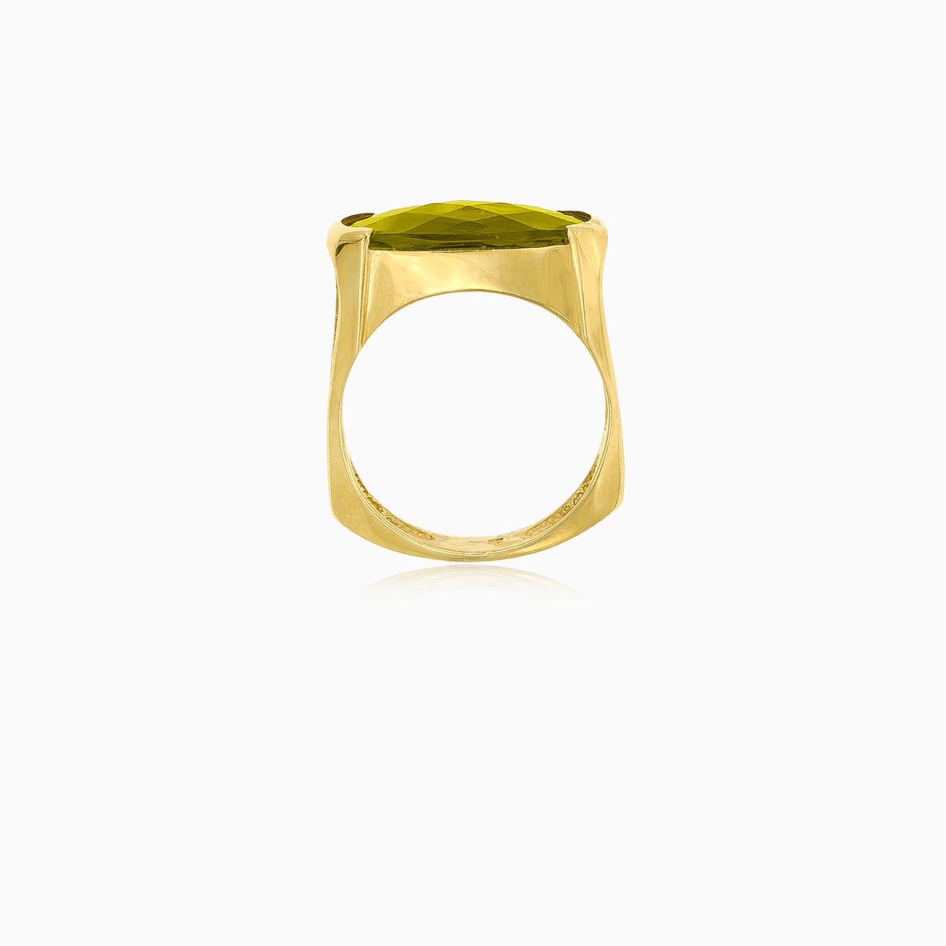 Habillez votre doigt avec sophistication grâce à cette bague pour femme en or jaune 14 carats. La captivante moldavite ovale taillée en gradins est mise en valeur par un élégant serti semi-clos. Une pièce intemporelle qui allie luxe et style avec harmonie.