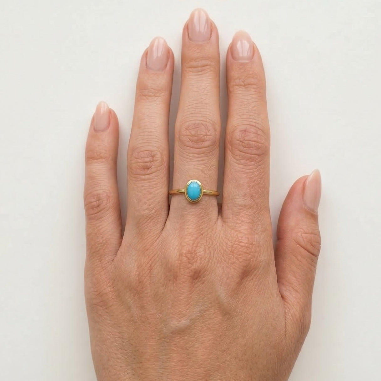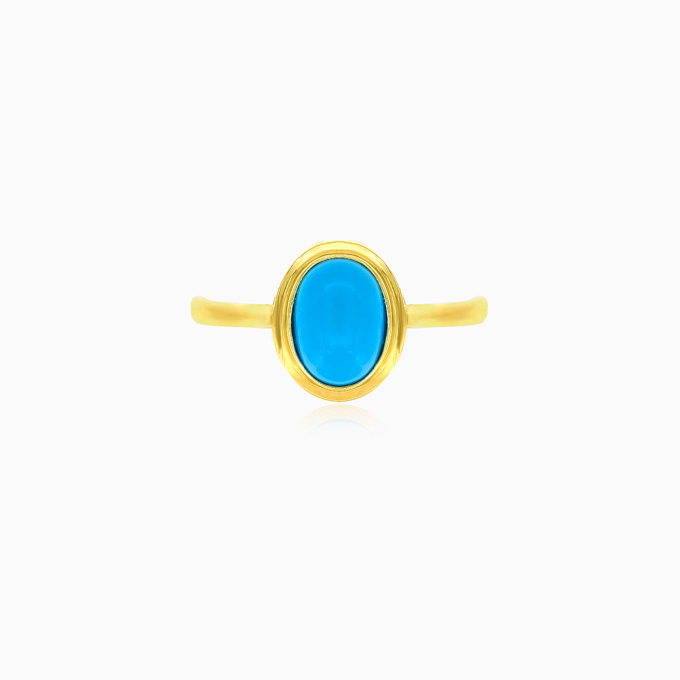Élégante bague pour femme en or jaune 14 carats ornée d’une envoûtante turquoise taillée en ovale, alliant sophistication et charme apaisant du bleu.