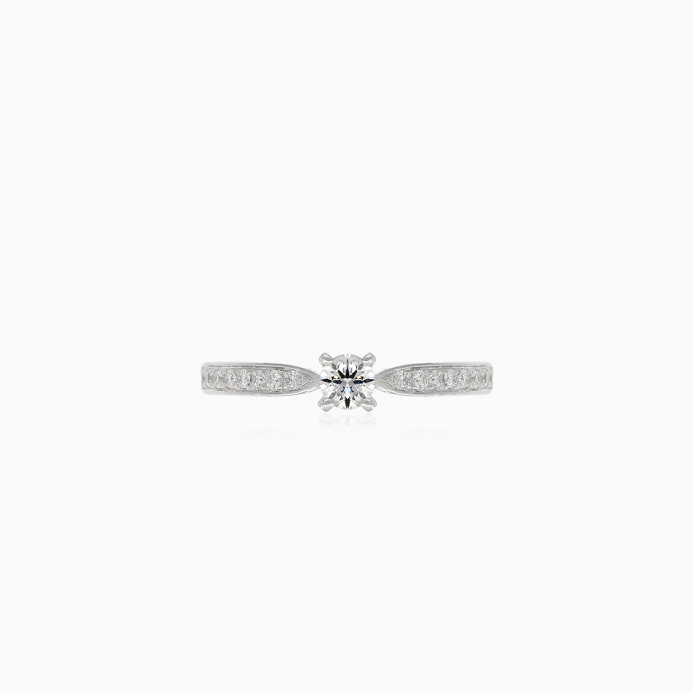 Cette bague de fiançailles exquise présente un diamant central de 0,24 ct entouré de pierres latérales totalisant 0,34 ct, sertis en or blanc 14 carats avec un sertissage griffes. Avec une pureté VS1 et une couleur G, elle dégage une élégance intemporelle.