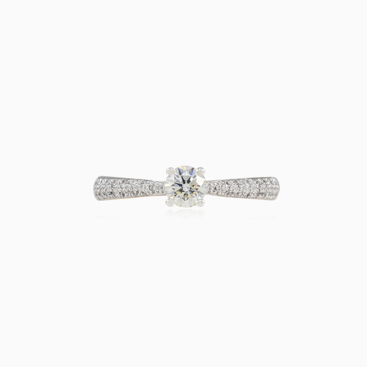 Bague de fiançailles avec diamants d’accent, dotée d’un anneau effilé, fabriquée à la main en or rose 14K. Le diamant central, serti dans une couronne en or blanc à 4 griffes, pèse 0,33 ct. Le poids total des diamants latéraux est de 0,23 ct.