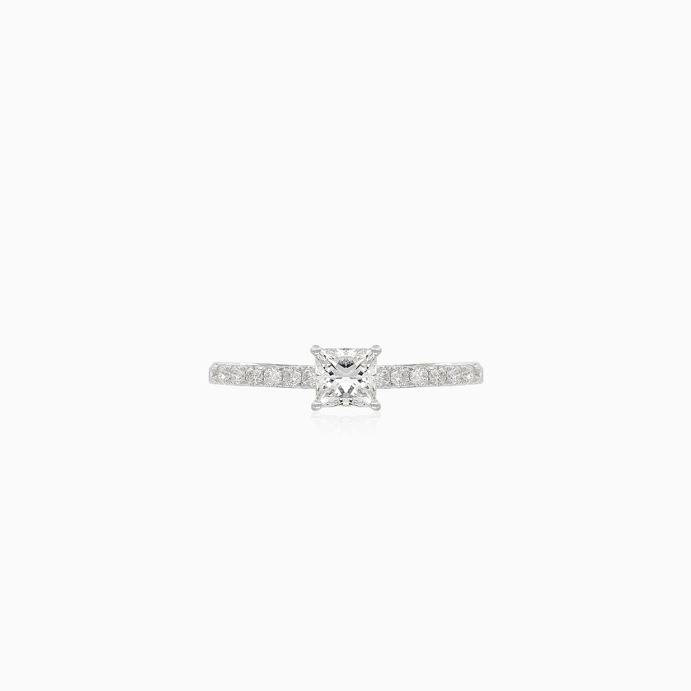 This exquisite 14kt white gold engagement ring features a central stone in a square princess-cut weighing 0.38ct, complemented by side stones in round fine step-cut totaling 0.16ct. Set in a prong setting, the diamonds boast clarity VS1 and color grade G, adding brilliance to this timeless piece.