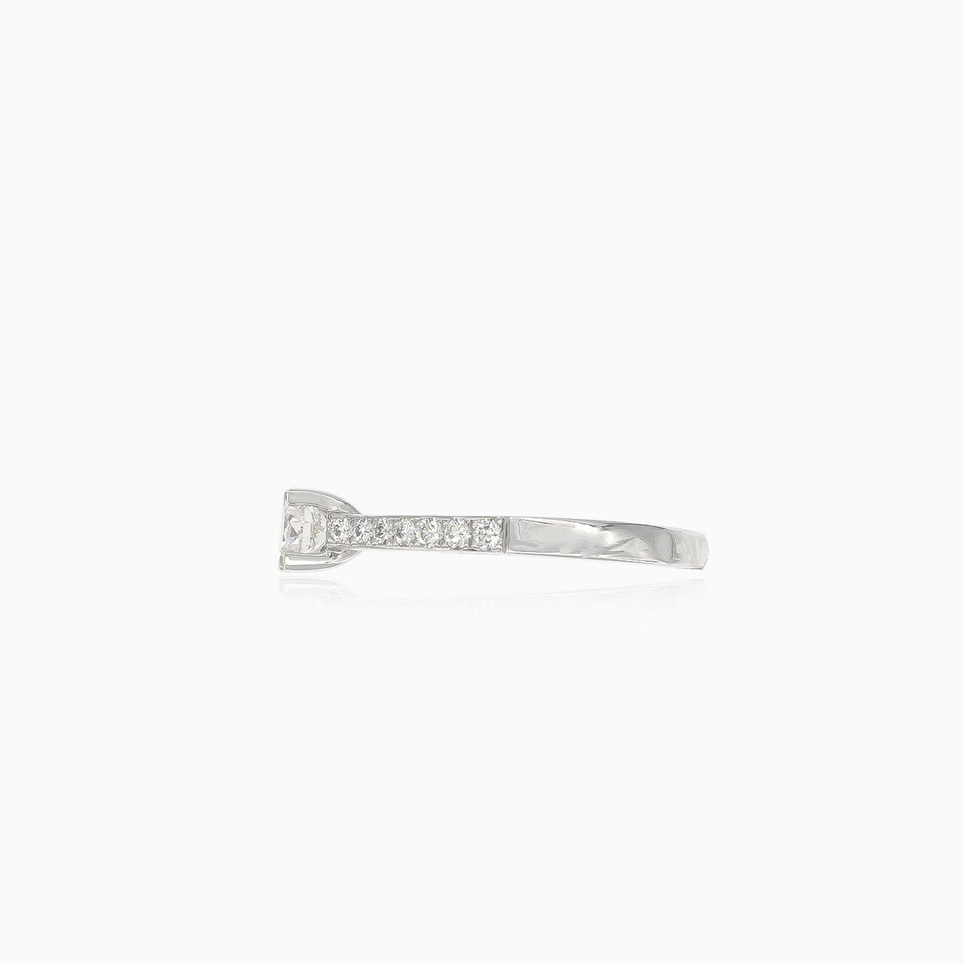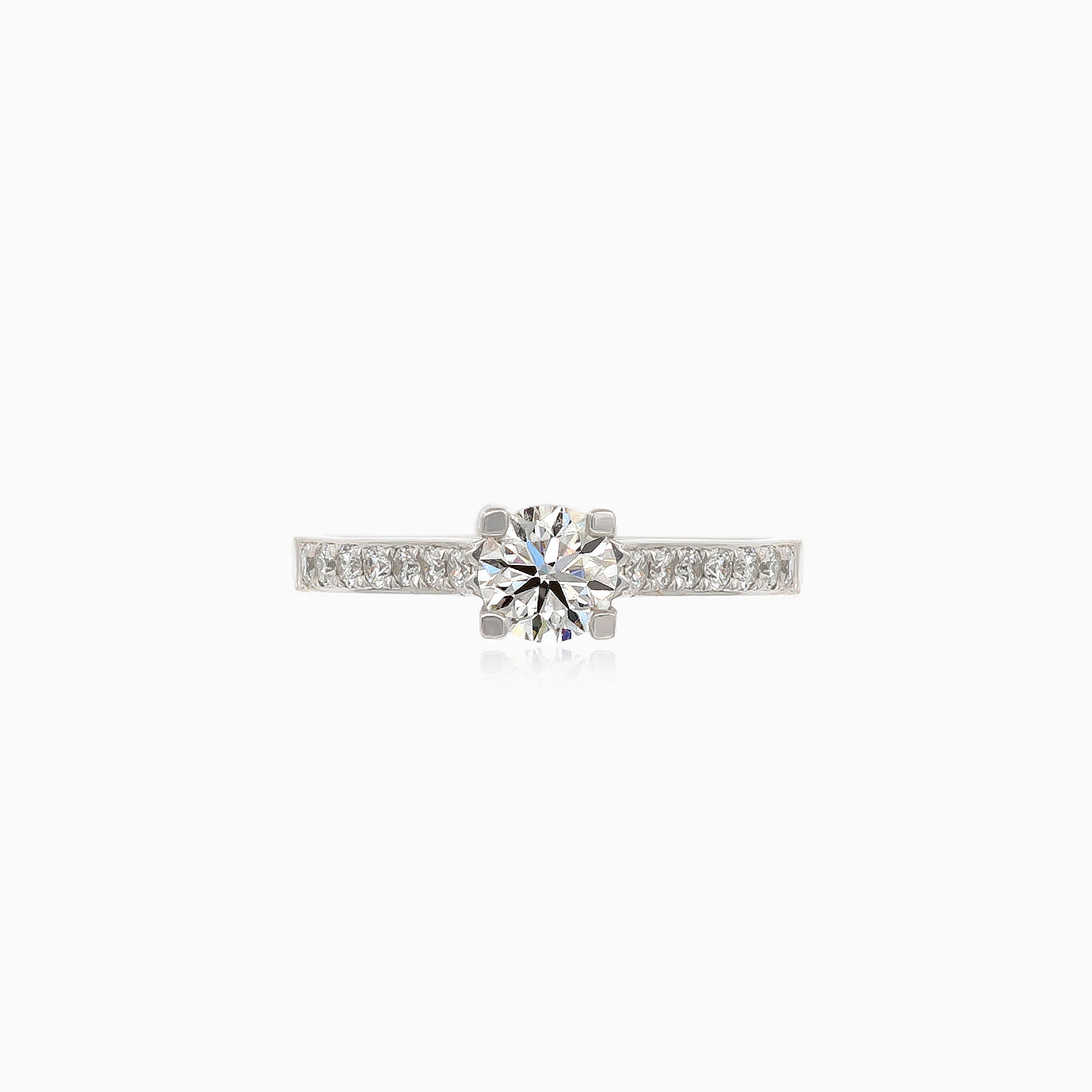 Bague en or blanc 14 carats ornée d’un diamant rond de 0,33 ct en sertissage à 4 griffes et de diamants ronds de 0,20 ct sur les côtés. Ces diamants présentent une pureté SI1 et une couleur H.