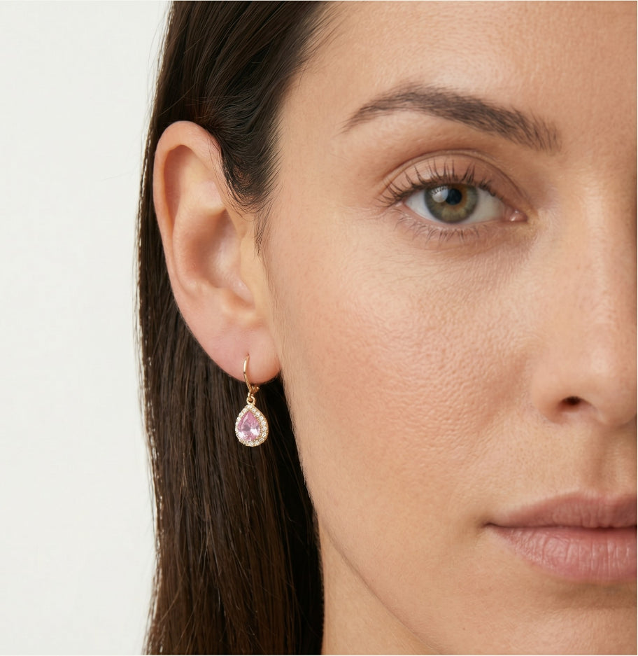 Boucles d'oreilles en or jaune avec crochet à levier et halo en forme de goutte.