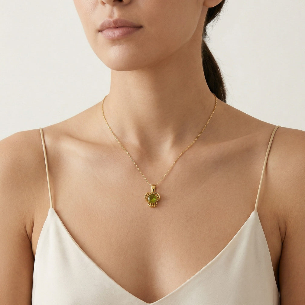 Adoptez la beauté éternelle avec notre pendentif en or jaune 14 carats, orné d’une Moldavite ronde à taille fine et étape au centre d’un délicat motif floral. Élégamment serti de trois griffes, ce bijou dégage un charme intemporel et une allure céleste.