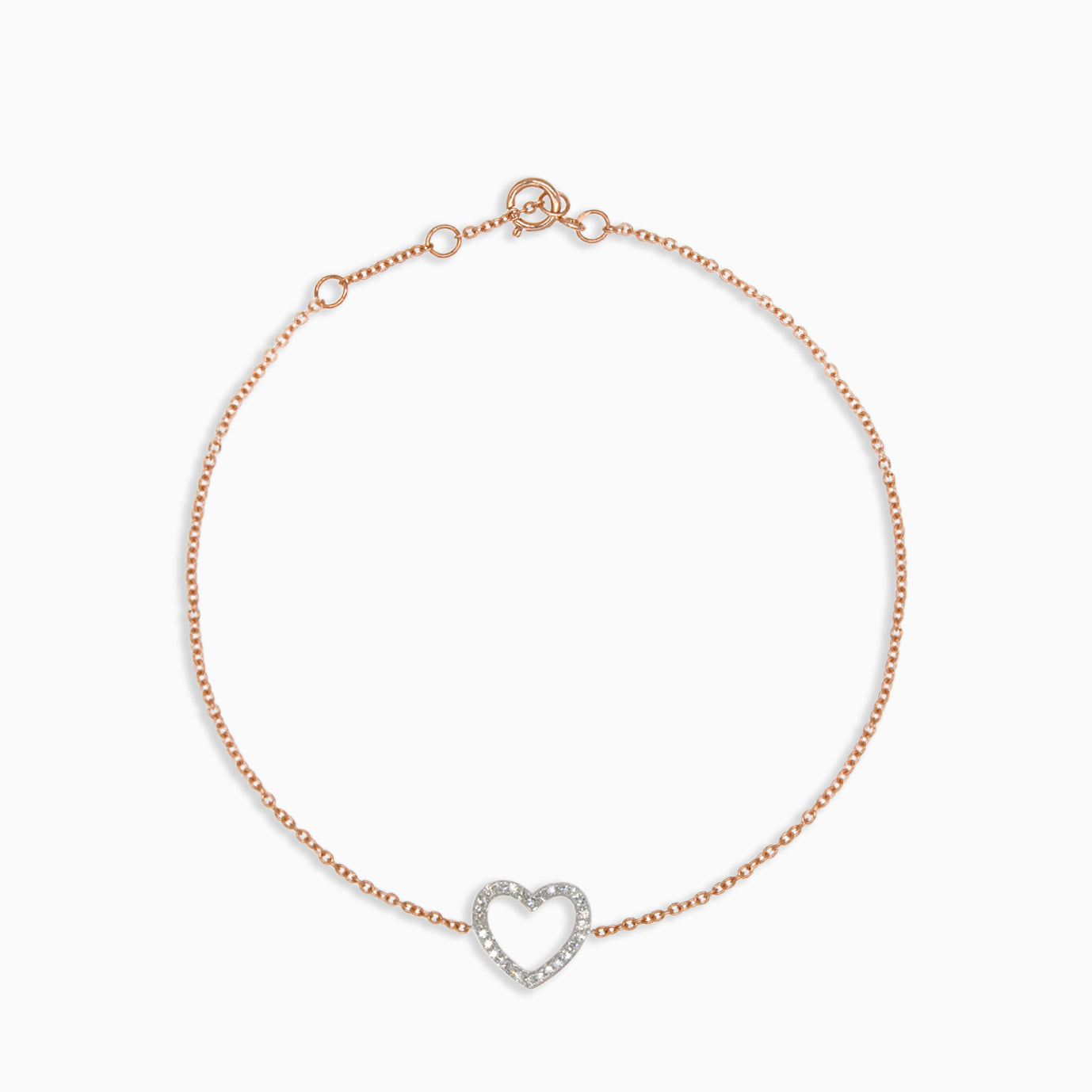 Tento jemný řetízkový náramek je vyroben z 14kt růžového zlata. Náramek má srdce zdobené brilianty o celkové hmotnosti 0,09 ct. Barva diamantů je H a čistota je SI1. Náramek má nastavitelné velikosti a pružnou kroužkovou karabinku pro pohodlné nošení.