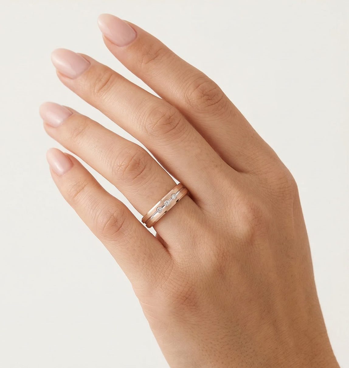 Tento elegantní snubní prsten je určen pro ženy i muže a je vyroben ze 14kt bílého a růžového zlata. Díky výraznému čtvercovému tvaru a tloušťce 4 mm kombinuje klasický a moderní styl. Prsten je k dispozici v hladkém provedení nebo s kubickým zirkonem či diamantem (0,06 ct) v kulatém jemném stupňovitém výbrusu, osazený rámečkem, a nabízí tak univerzální eleganci pro každou příležitost.