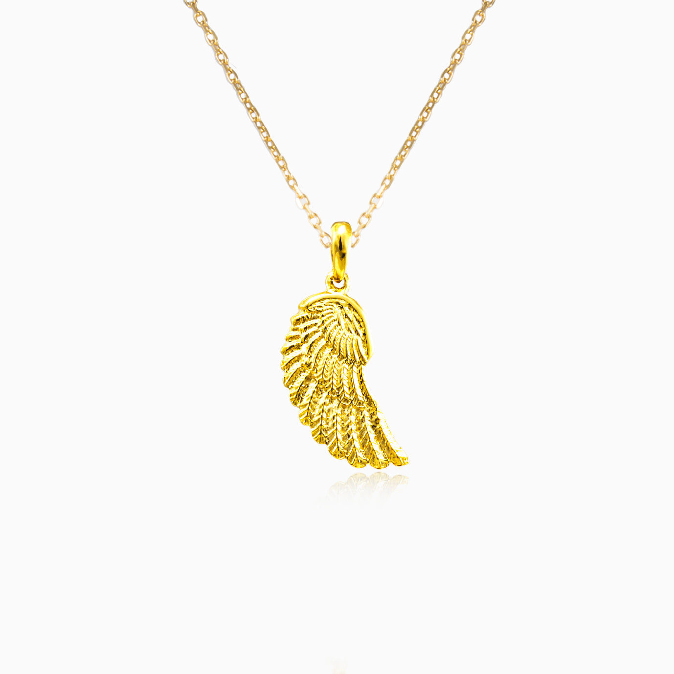 Složitý přívěšek ve tvaru zlatého křídla zdobený podrobnými detaily.