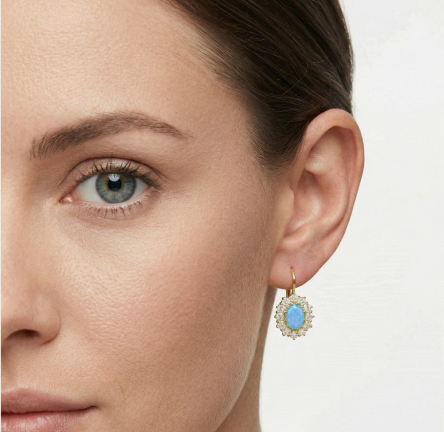 Královské náušnice jsou vyrobeny z 14K žlutého zlata a jsou doplněny velkým středovým oválným modrým opálem. PO obvodu středového kamene se nachází svatozář, kterou tvoří kulaté kameny, které jsou z kubických zirkonů.