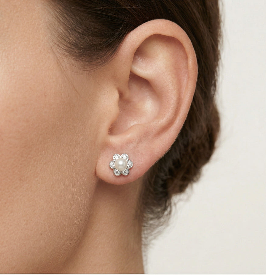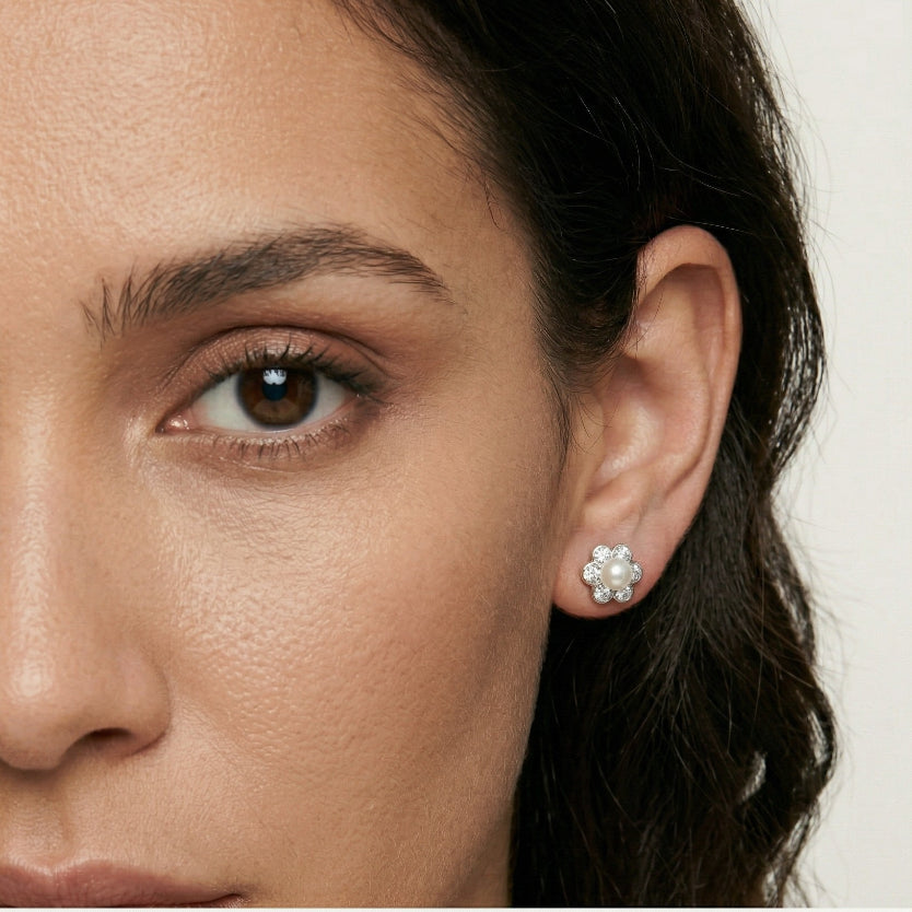 Ozdobte své uši elegancí v těchto okouzlujících stříbrných květinových náušnicích zdobených lesklými perlami a třpytivými zirkony.
